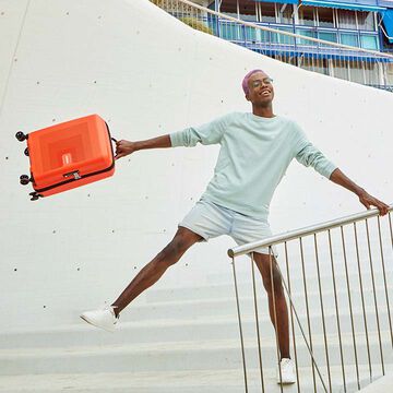 Double wheels for great stability and a smooth rolling for all surfaces. Ergonomic integrated top and side carry handle